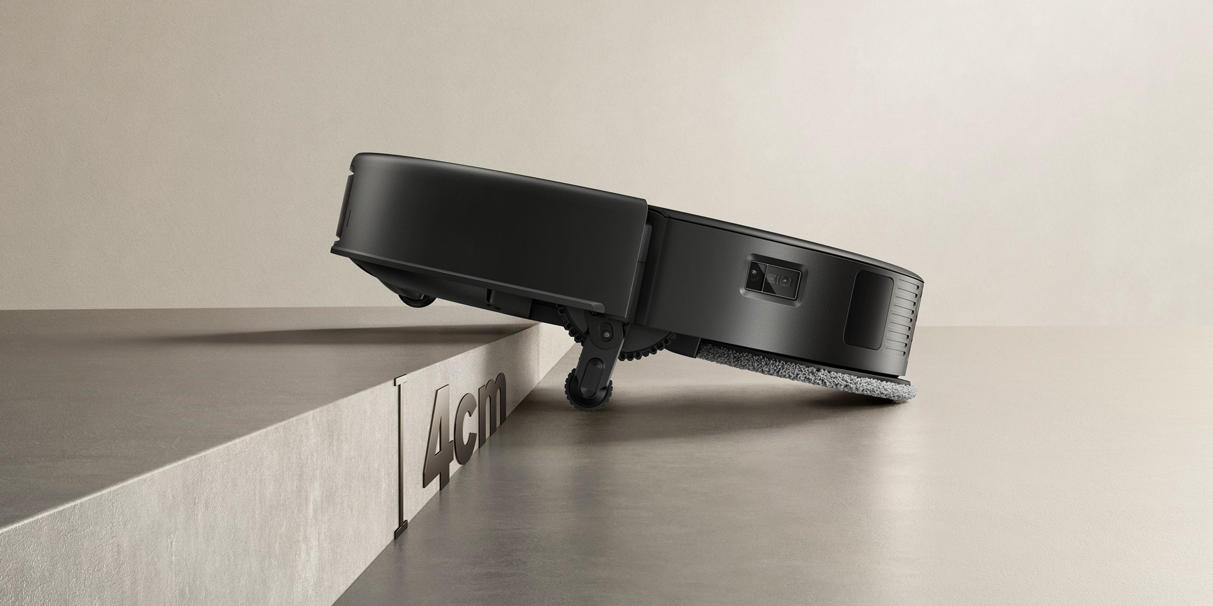 Mit seinen StepMaster™-Rädern kann der Saugroboter sein Gehäuse anheben und so über Stufen, Schwellen, Türschienen, U-förmige Möbelstücke und andere kleine Hindernisse mit einer Höhe von bis zu 6 cm* fahren.