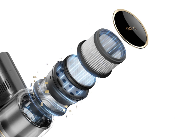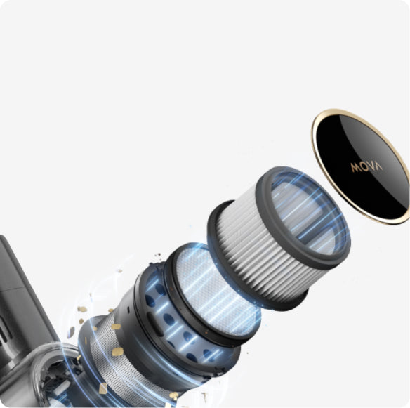 Ein 5-stufiges Filtersystem fängt Feinstaub und Partikel mit bis zu 0,3 µm* Größe effizient ab und verhindert deren Freisetzung in die Luft mit einer Filtereffizienz von bis zu 99,9 %*.