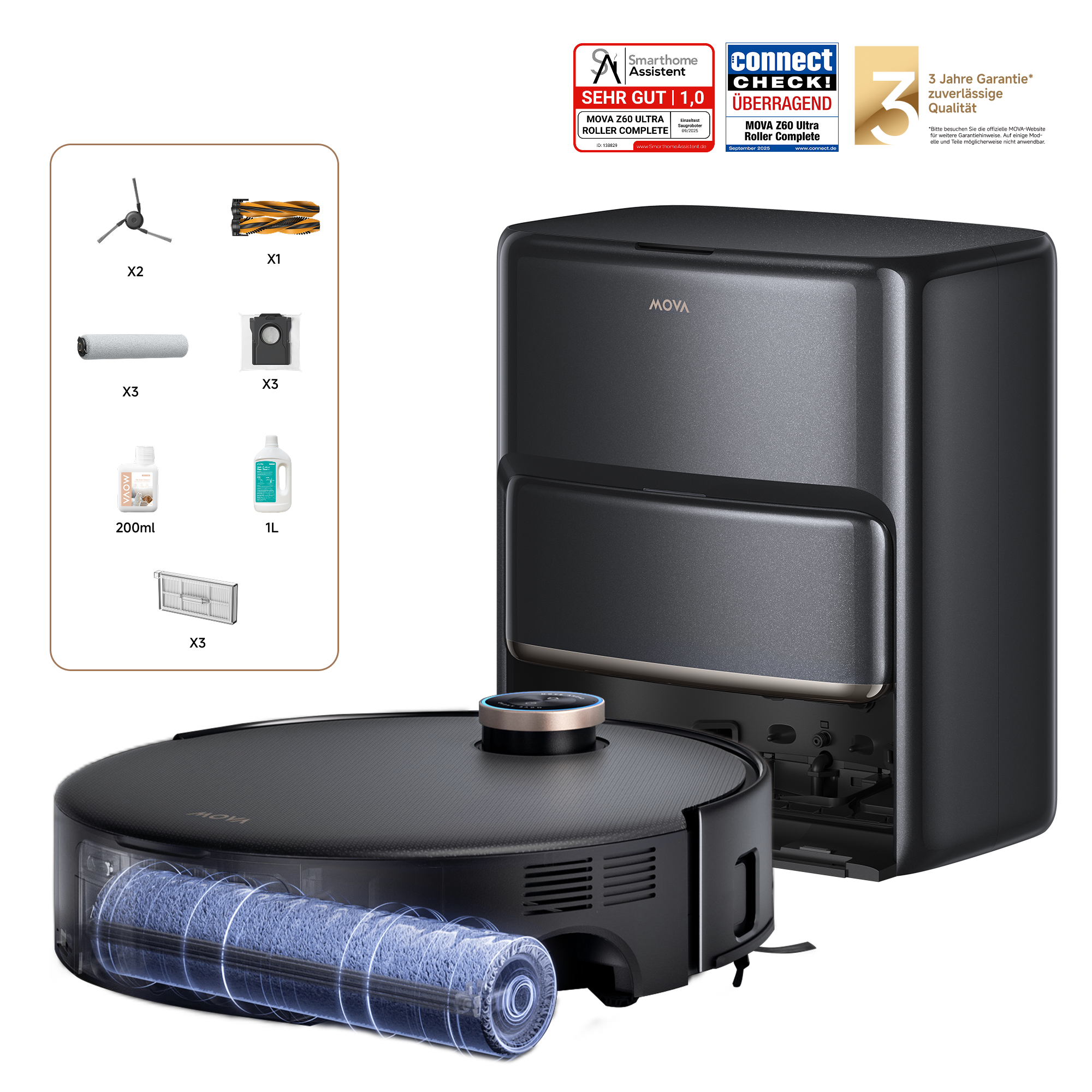 *MOVA Z60 Ultra Roller Complete enthält ein zusätzliches Zubehörset mit: 1 Hauptbürste, 2 Seitenbürsten, 3 Staubbeutelfiltern, 3 Staubbeuteln, 3 Rollenwischern, 1 Liter Reinigungslösung und 1x 200 ml Reinigungslösung gegen Tiergerüche.